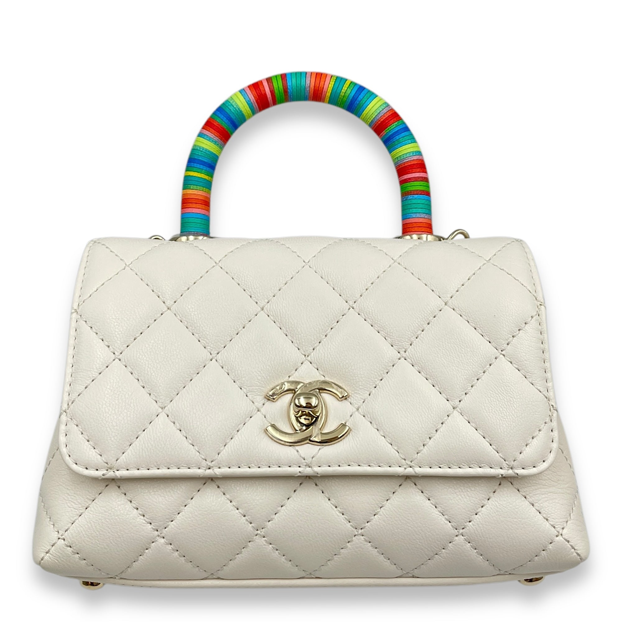 Quilted Coco Handle (18cm) Mini White, Rainbow Handle Crossbody Bag in Calfskin, Gold hardware